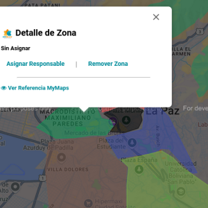 Este sistema facilita la integración con herramientas de mapeo, como MyMaps de Google Maps, permitiendo cargar y gestionar zonas directamente en la plataforma. Las zonas importadas pueden visualizarse y administrarse sin depender de otras aplicaciones, asignando responsables y programando actividades con días y horarios específicos. Además, permite la creación y asignación automática de tareas de campo a los responsables designados, optimizando la coordinación y ejecución de actividades en cada zona.